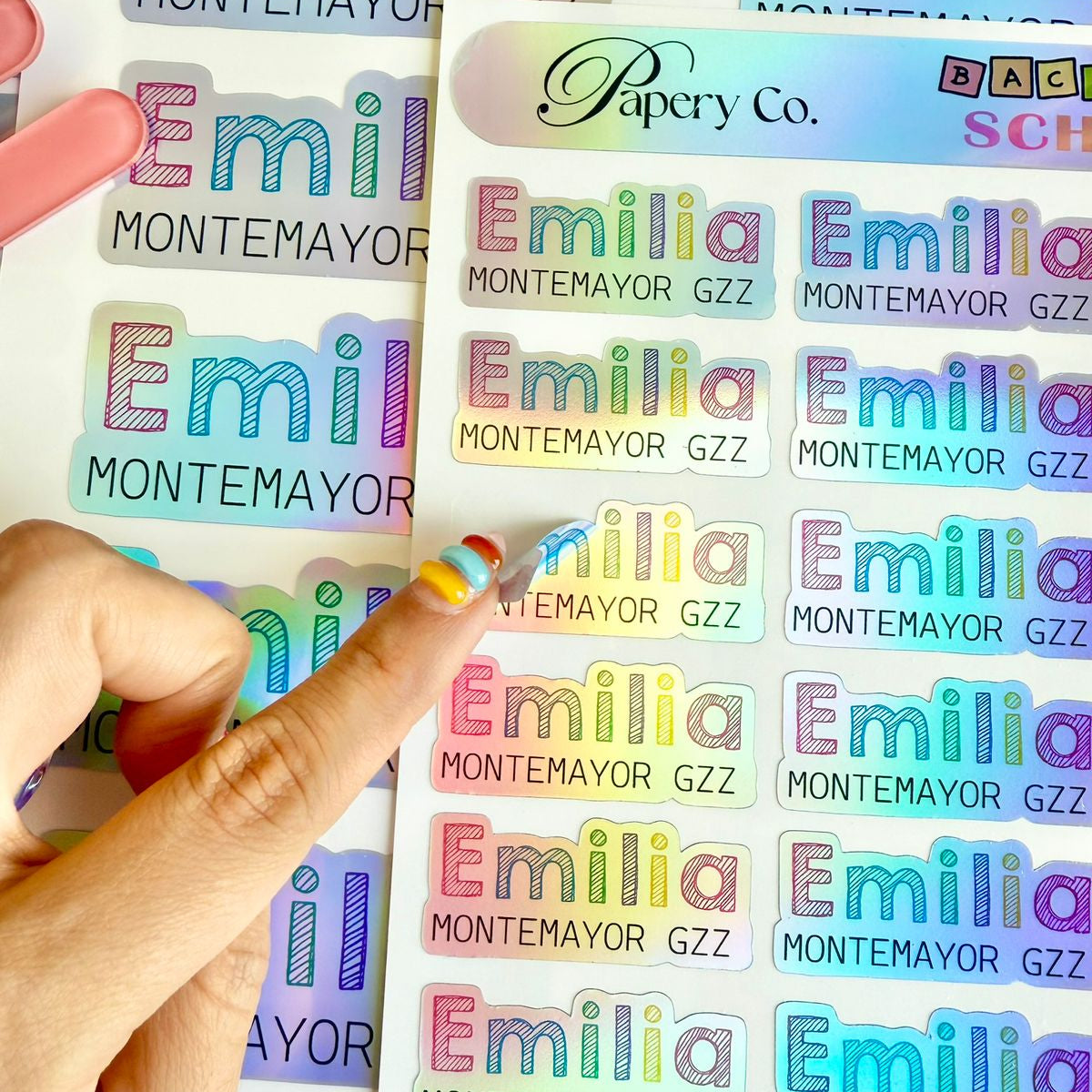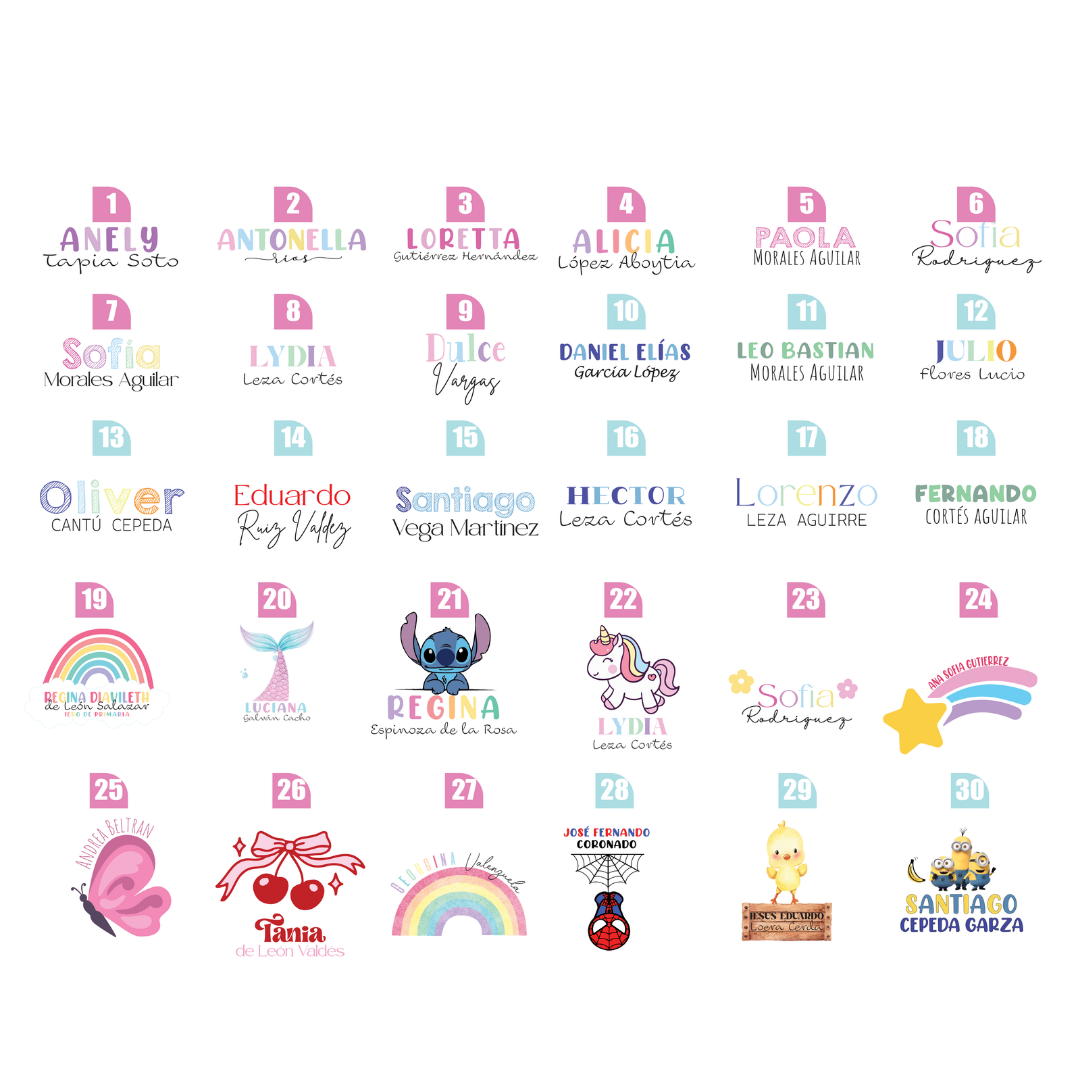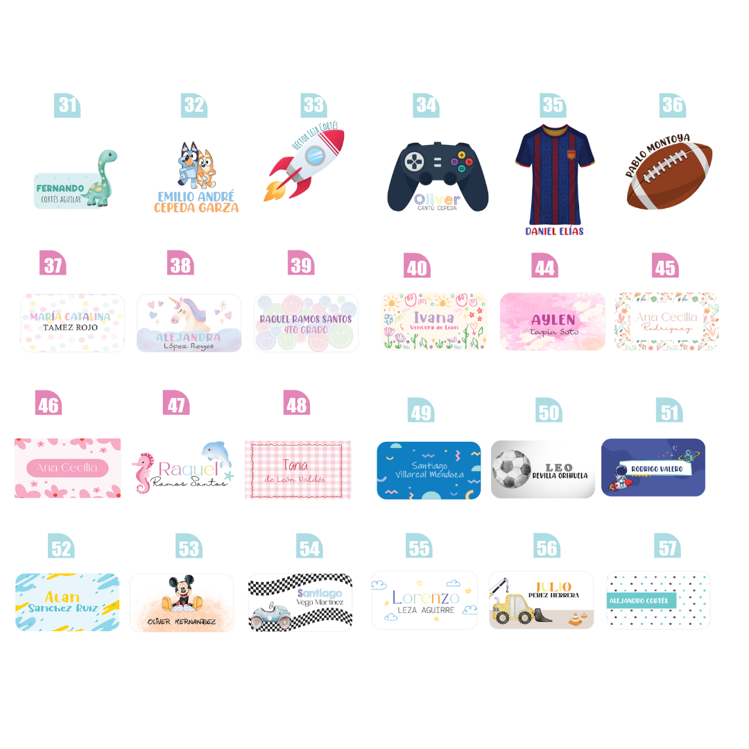Todas nuestras etiquetas van impresas en vinilo resistente al agua y al desgaste, ¡listas para aguantar el día a día escolar! Personalízalas con el nombre de tu peque y haz que cada cosa vuelva a su lugar.
